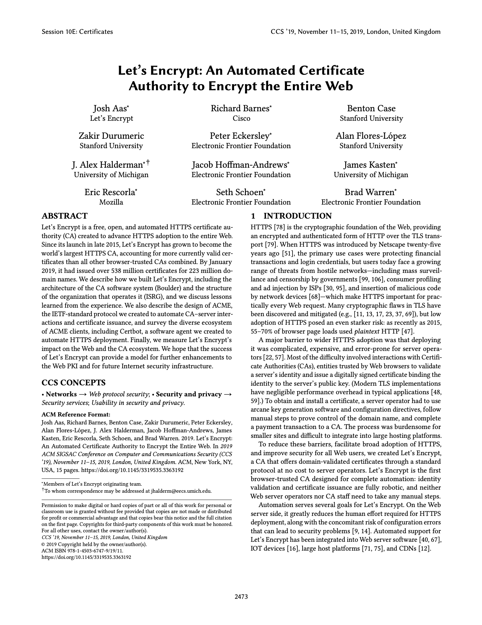 —Josh Aas, Richard Barnes, Benton Case, Zakir Durumeric, Peter Eckersley, Alan Flores-Lรณpez, J. Alex Halderman, Jacob Hoffman-Andrews, James Kasten, Eric Rescorla, Seth Schoen, and Brad Warren. 2019. Let's Encrypt: An Automated Certificate Authority to Encrypt the Entire Web. In Proceedings of the 2019 ACM SIGSAC Conference on Computer and Communications Security (CCS '19). Association for Computing Machinery, New York, NY, USA, 2473โ2487. https://doi.org/10.1145/3319535.3363192