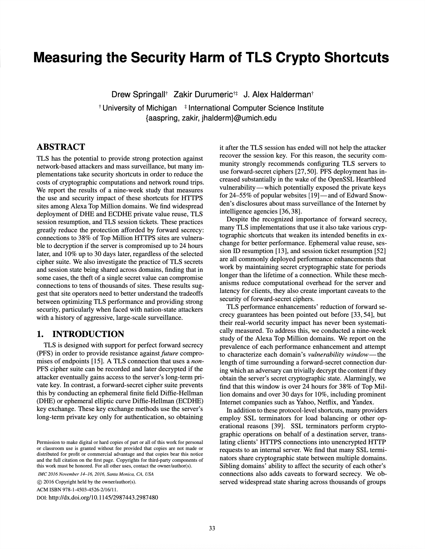 —Drew Springall, Zakir Durumeric, and J. Alex Halderman. 2016. Measuring the Security Harm of TLS Crypto Shortcuts. In Proceedings of the 2016 Internet Measurement Conference (IMC '16), Association for Computing Machinery, Santa Monica, California, USA, 33-47. https://doi.org/10.1145/2987443.2987480